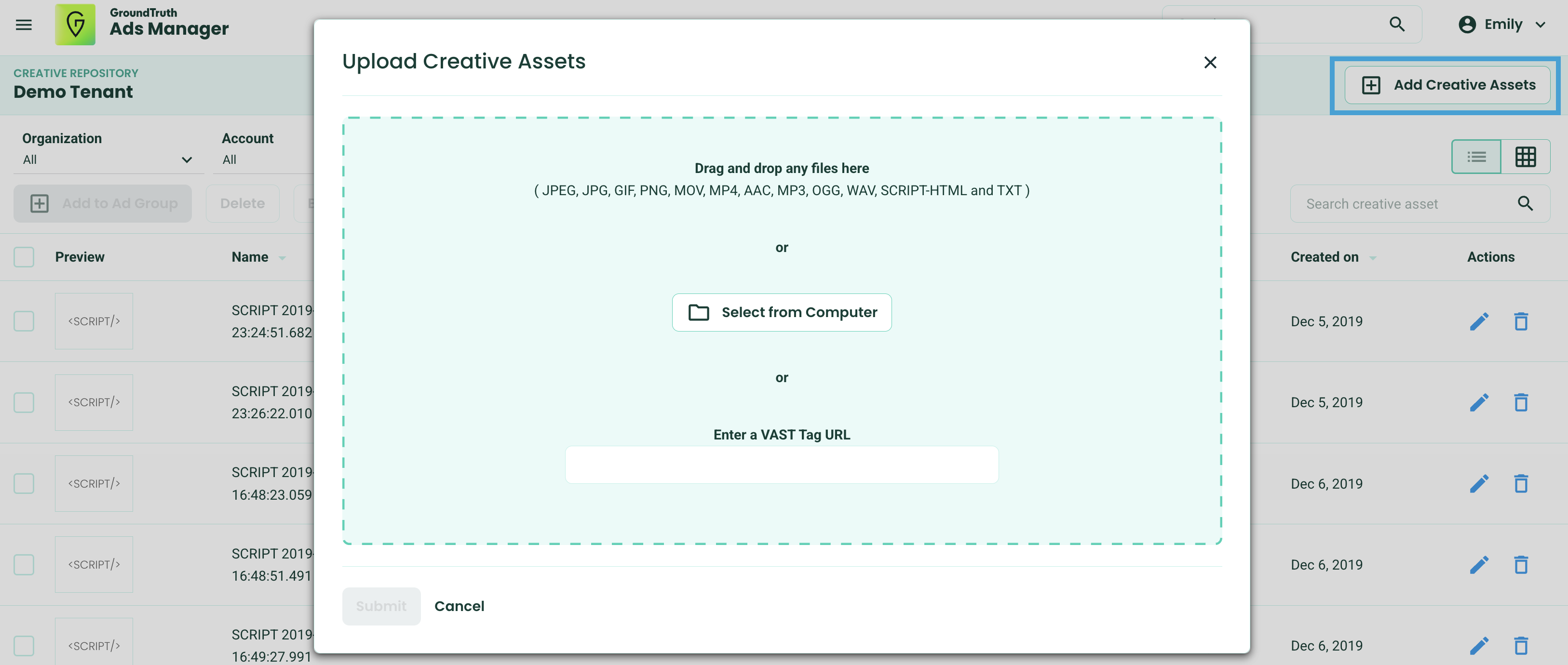- Creative repository supports uploading image creatives (JPEG, JPG, GIF, PNG), video creatives (.MOV, .MP4, VAST tag), audio creatives (.AAC, .MP3, .OGG, .WAV), and script (HTML and TXT).