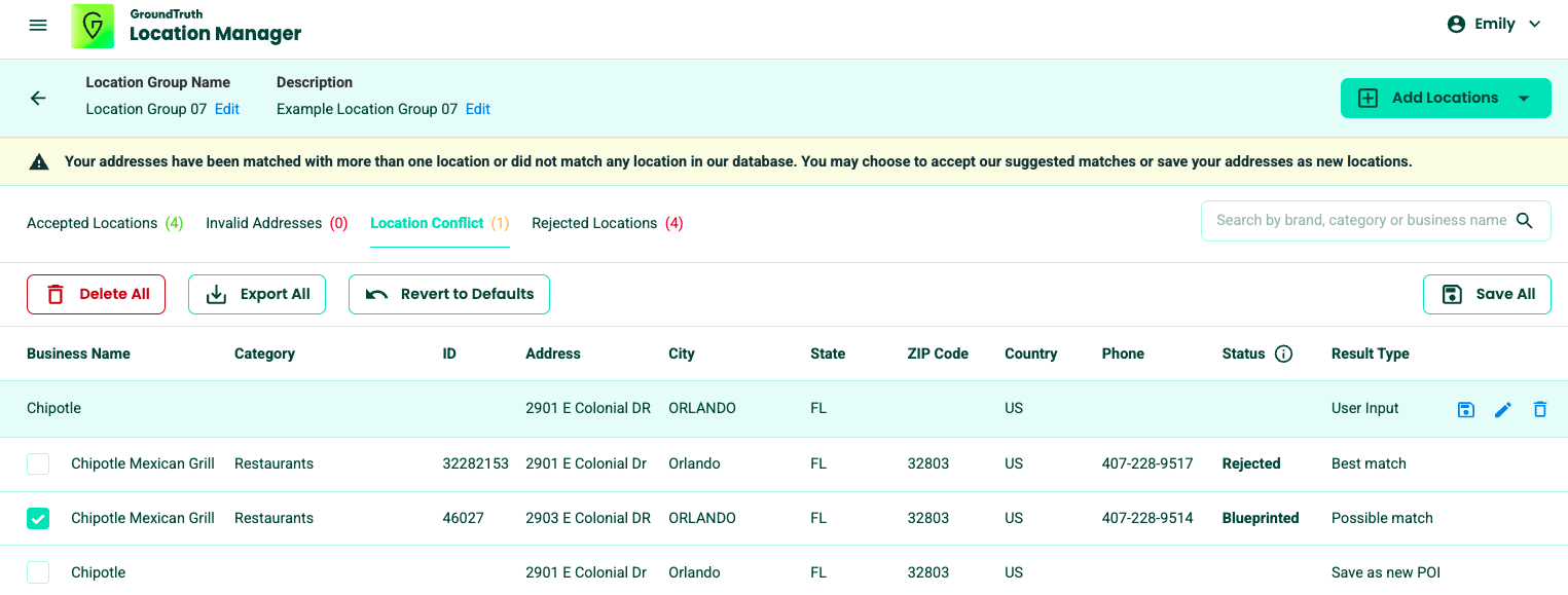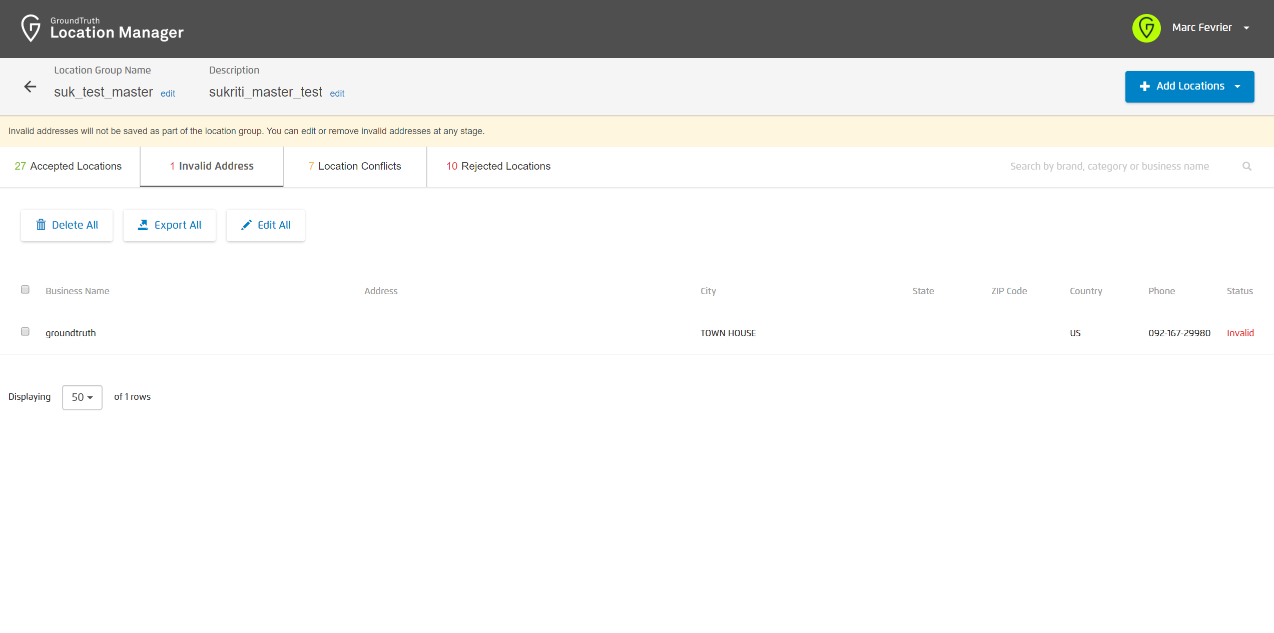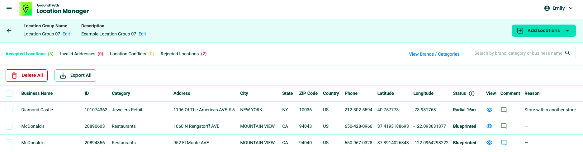 - The number of locations within each location group, as well as their breakdown to "Accepted Locations", "Invalid Addresses", "Locations Conflict", and "Rejected Locations" tabs.