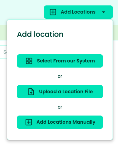 - In the newly created location group, click the "+ Add Locations" button and choose from 3 options to add your locations: