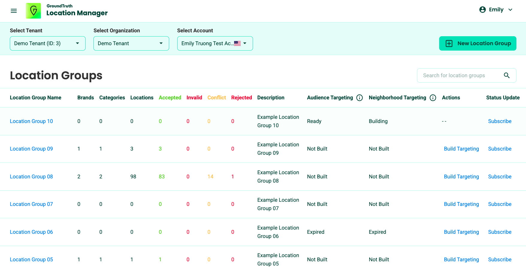Location Group (LG): A custom targeting list of POIs (Points of Interests) that a user can create and manage. Unlike GroundTruth's standard Brand or Category lists which is available across all Tenants and Accounts, a Location Group lives under a dedicated Account. Once created, the Location Group can be saved, easily updated, and reused across multiple campaigns (all within the same Account).