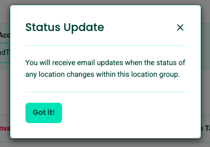 As a default, you will be automatically subscribed to receive status notifications upon creation of a new Location Group. You'll receive email alerts about key changes, like blueprint progress, for you POIs (points of interests; aka the locations within your Location Group)