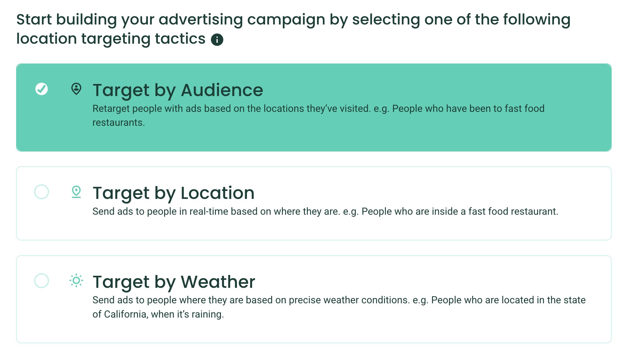 To enable Audience or Neighborhood targeting of your Location Group in Ads Manager, select Target by Audience or Target by Neighborhood when building a new campaign in Ads Manager.