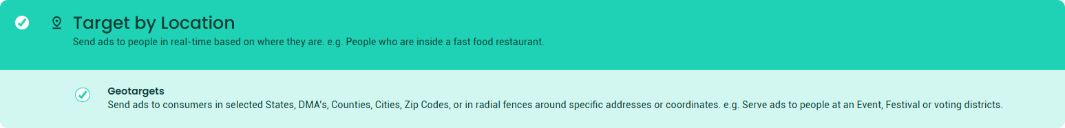 | Target by Location | Reach listeners by specifying State, DMA, or Zip Code filters. |