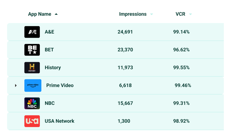 Gain complete transparency into where every impression is served with our Network-Level Reporting. Access a detailed breakdown of impressions and video completion rates by app, plus more valuable insights.