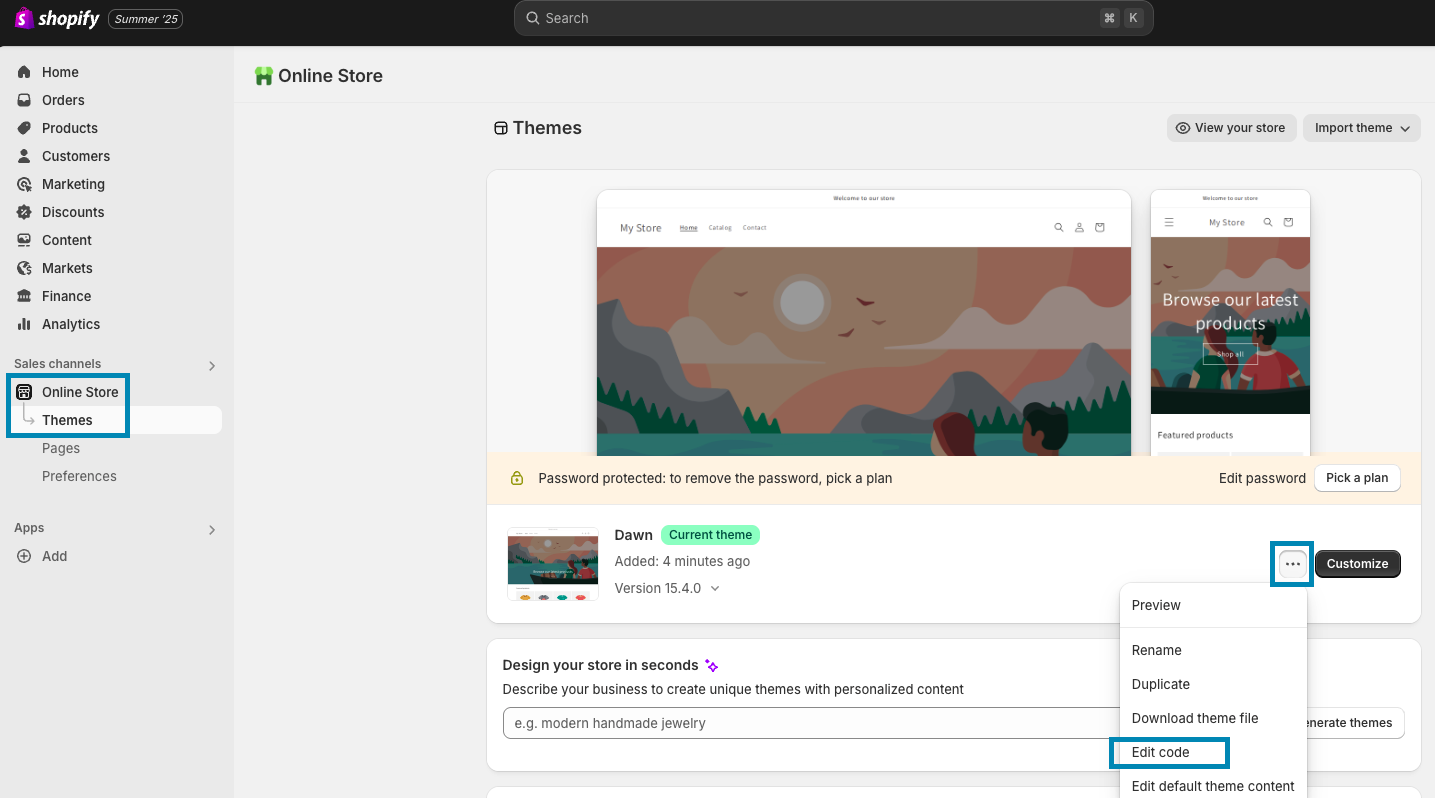 - From the Shopify admin dashboard, select Online Store → Themes from the left menu.