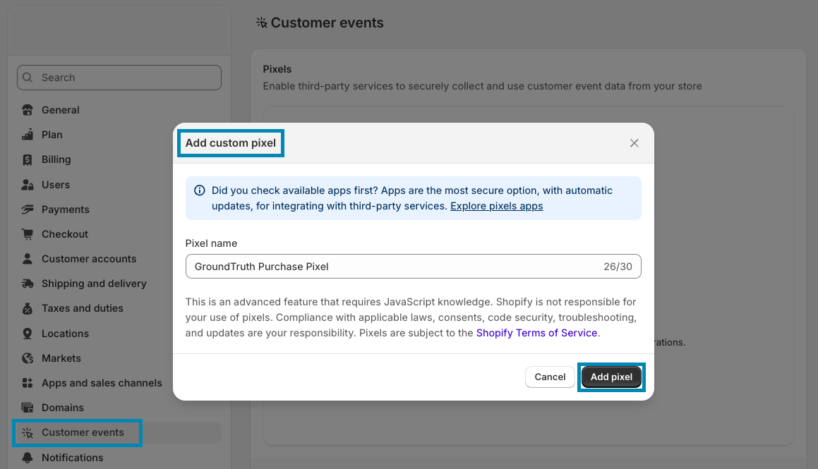 Install the GroundTruth Pixel as Shopify Custom Pixel