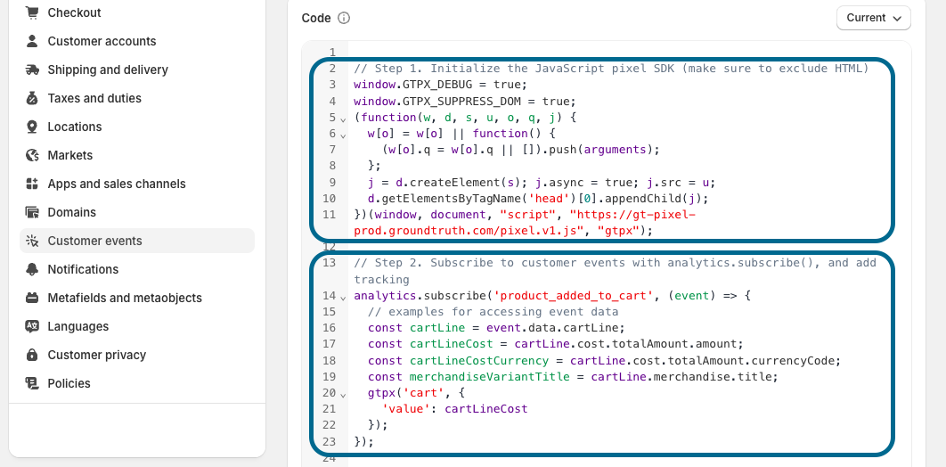 Copy and paste the following Cart event code, under // Step 2. Subscribe to customer events with analytics.subscribe(), and add tracking. This subscribes you to Shopify's product_added_to_cart analytics event.
