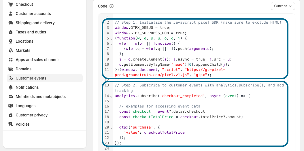 By using both methods, you can capture the full range of user behaviors. To install the pixel manually on your Shopify website, follow the instructions below. For more information about Shopify pixels and customer events, refer to Shopify’s Pixels overview and Shopify’s Pixels and customer events.