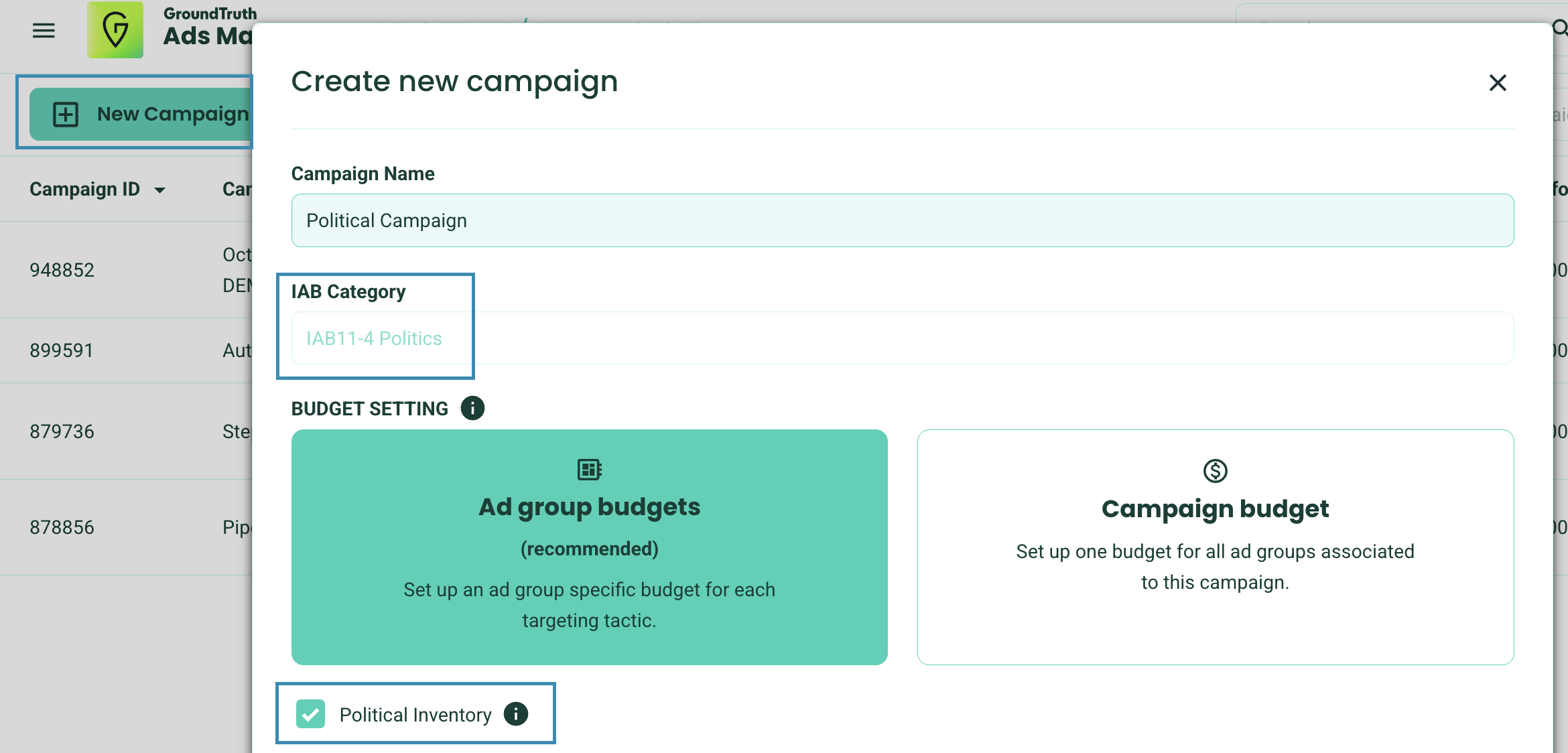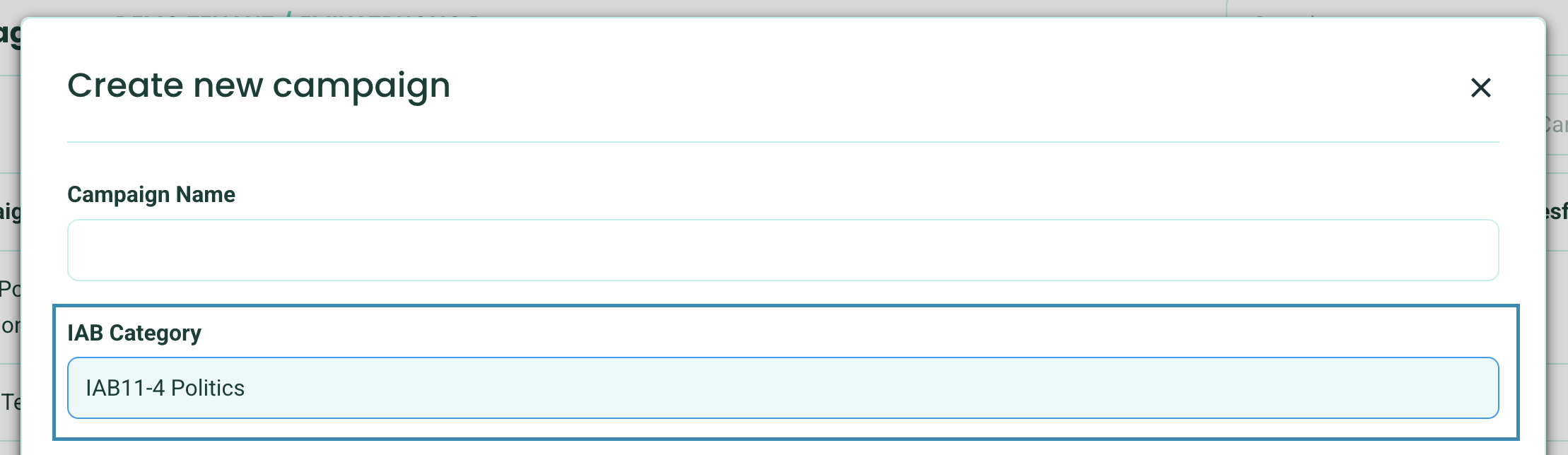 - Select IAB11-4 Politics from the IAB Category drop-down when creating a new campaign.