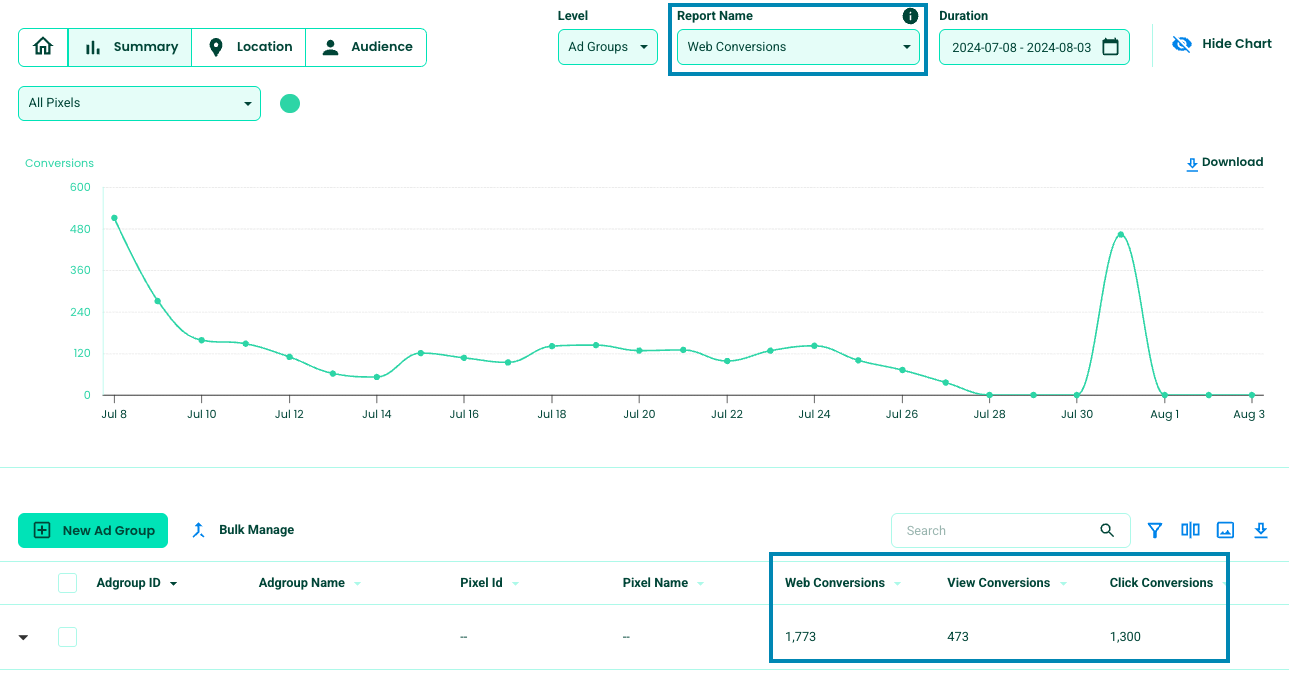 - The graph above the table will show one line tracking web conversions per day. You can change the start and end date of the report using the Duration feature.
