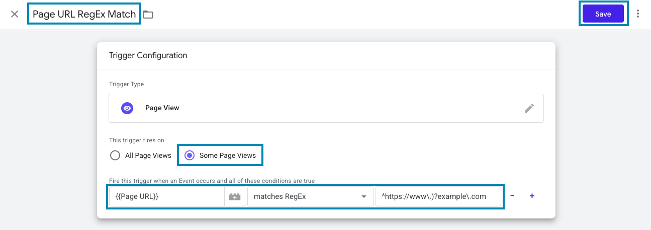 - Name the Trigger (e.g., Page URL RegEx Match)